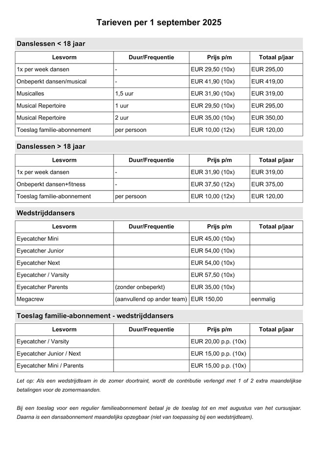 Let op: Bij herinschrijving vóór 20 augustus verbind je je opnieuw aan deelname voor het volledige dansseizoen (september t/m juni). Indien wij geen uitschrijving ontvangen vóór 20 augustus, wordt het lidmaatschap stilzwijgend verlengd. In dat geval is het lidmaatschap vanaf september maandelijks opzegbaar, met een toeslag van € 12,50 per maand.